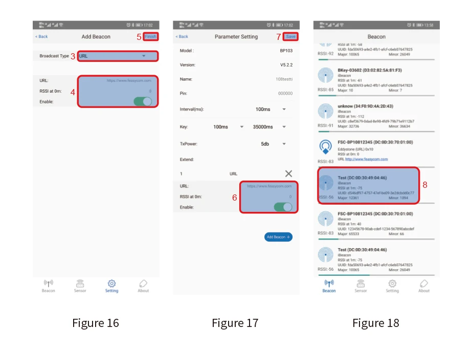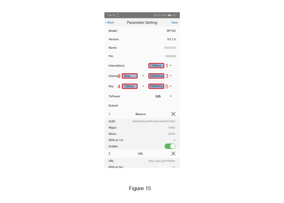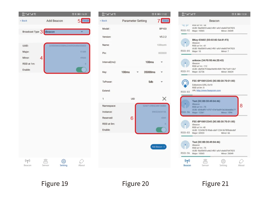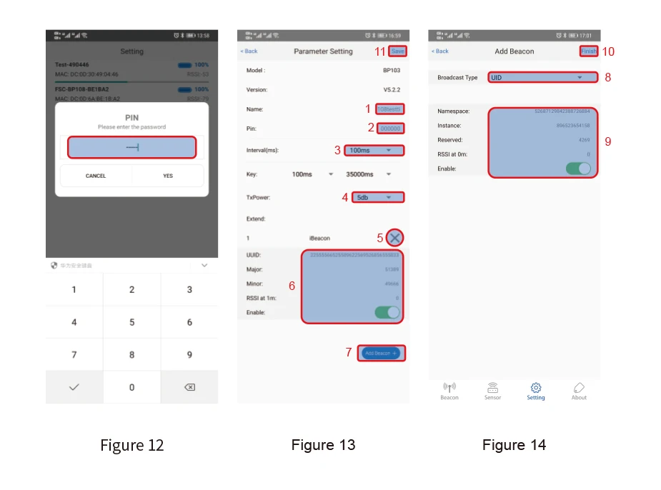 ④ After connected successfully, you can configure the beacon parameters or add new broadcasts, click “Save” after finished. (as Figure 13, 14 )