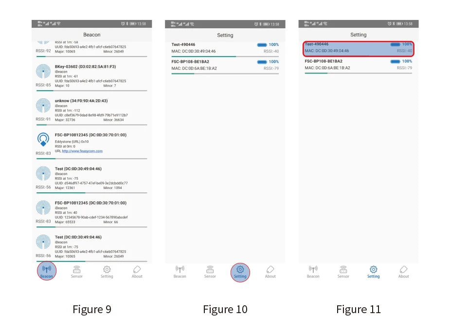 ① Open FeasyBeacon app, in the “Beacon” interface, you can see the beacons nearby. (as Figure 9)