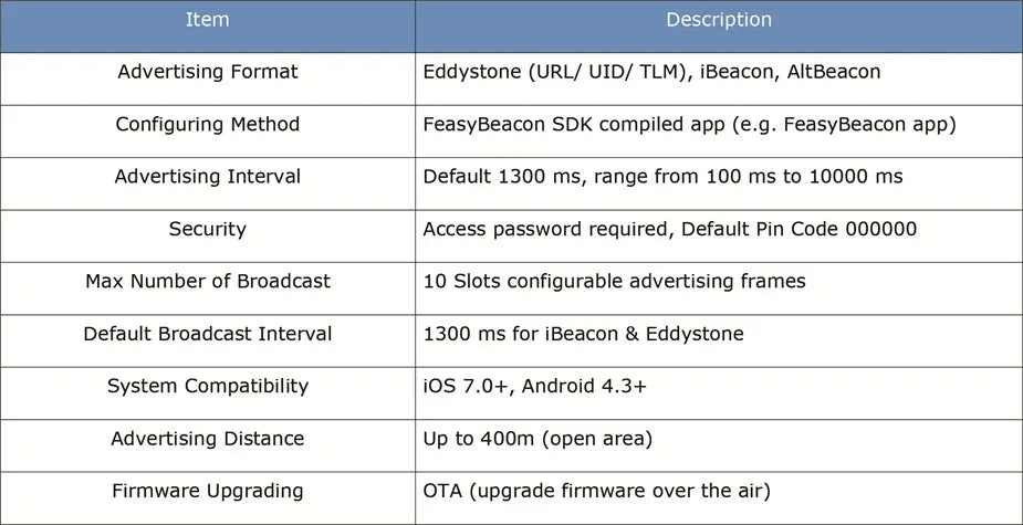"FeasyBeacon” app is available on iOS App Store and Google Play Store. Before using the beacon, please install the app first.